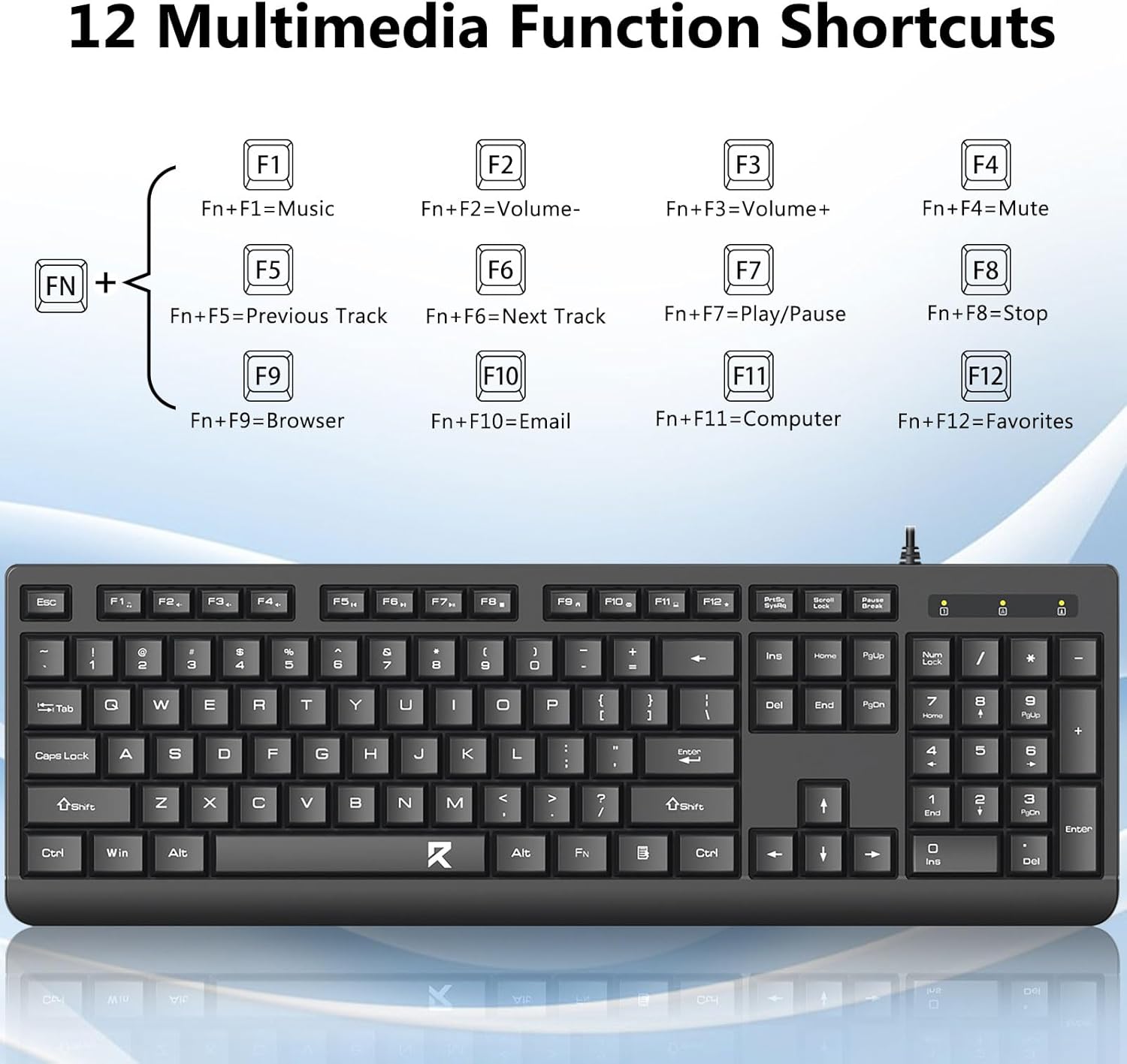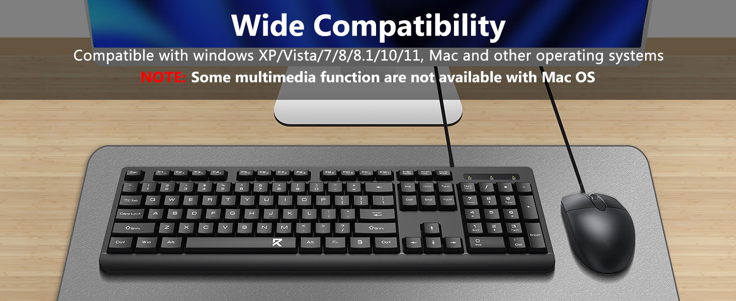 Die volgrootte sleutelborduitleg sluit 'n numeriese sleutelbord, multimediasleutels en gemaklike spasiëring tussen sleutels in. Die meegaande muis is ontwerp vir akkurate dop en gladde wyserbeweging oor verskeie oppervlaktes.