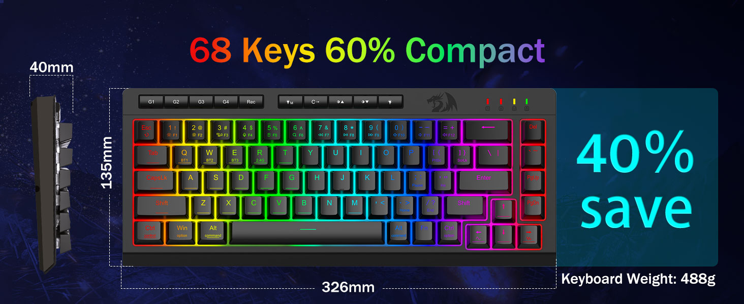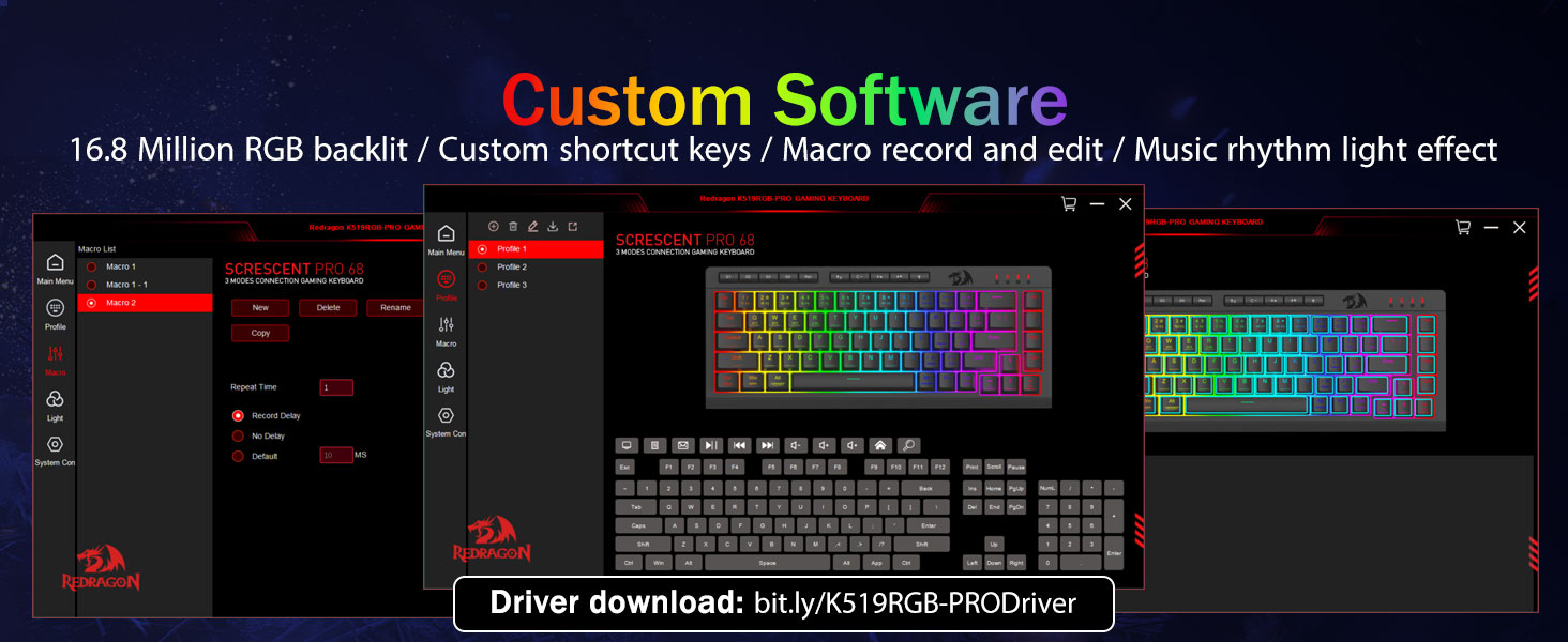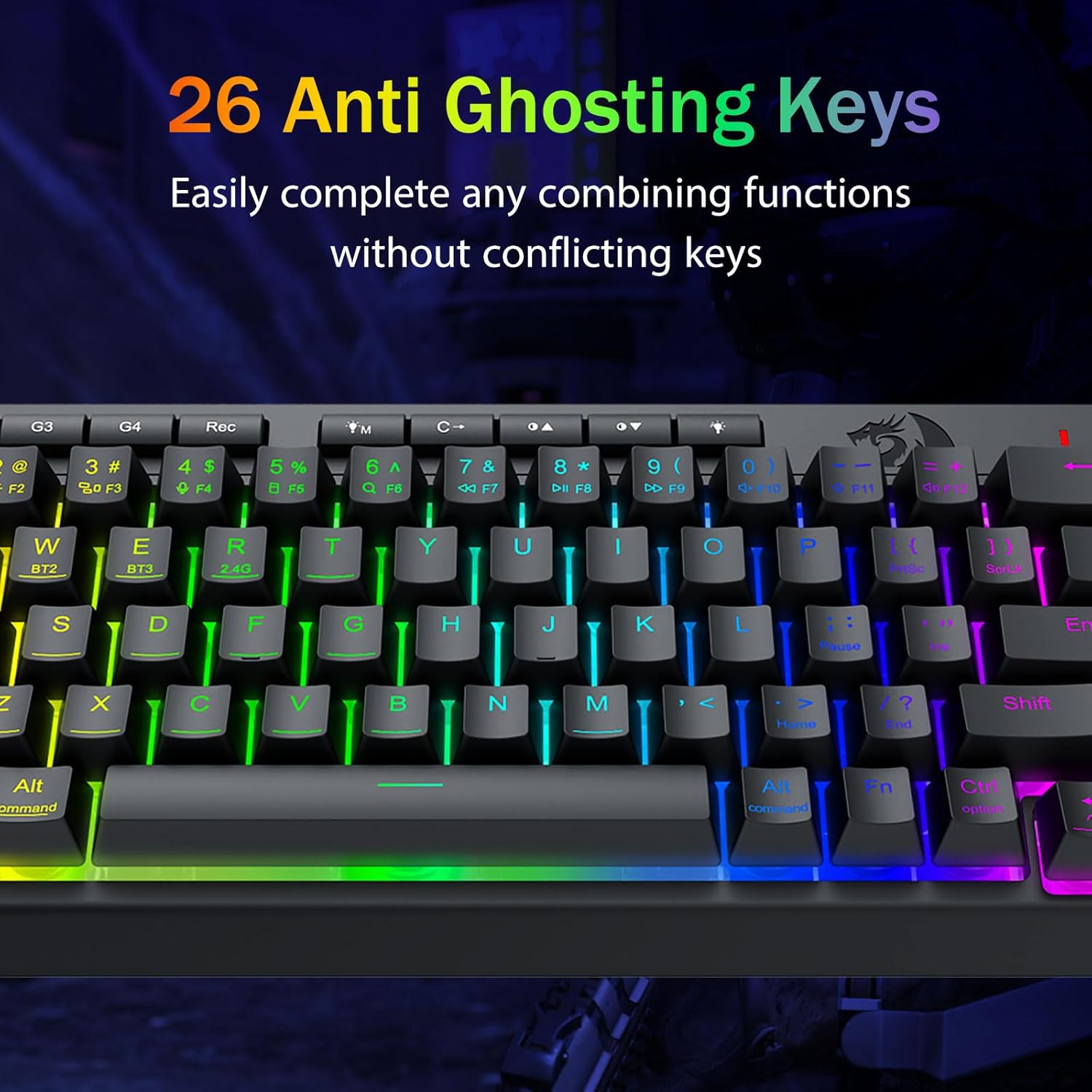 Die Black K519 Pro Portable Wireless Gaming Keyboard van Redragon, vervaardig deur Chuangquan, is 'n voorbeeld van professionele ingenieurswese vir spelers sowel as professionele persone. Sy veelsydige drie-modus-ontwerp ondersteun stabiele Bluetooth, lae-latency 2.4GHz draadlose en USB-C bedrade verbindings, wat moeitelose oorskakeling tussen drie toestelle gelyktydig moontlik maak. Die sleutelbord bevat toegewyde makrosleutels wat volledig aangepas kan word via intuïtiewe sagteware, wat gebruikers in staat stel om komplekse opdragte of kortpaaie toe te wys vir verbeterde produktiwiteit en speldoeltreffendheid. Dinamiese RGB-beligting met veelvuldige effekte verpersoonlik die opstelling, terwyl N-sleutel omrol en anti-spookbeeld verseker dat elke toetsaanslag akkuraat geregistreer word tydens intense sessies.