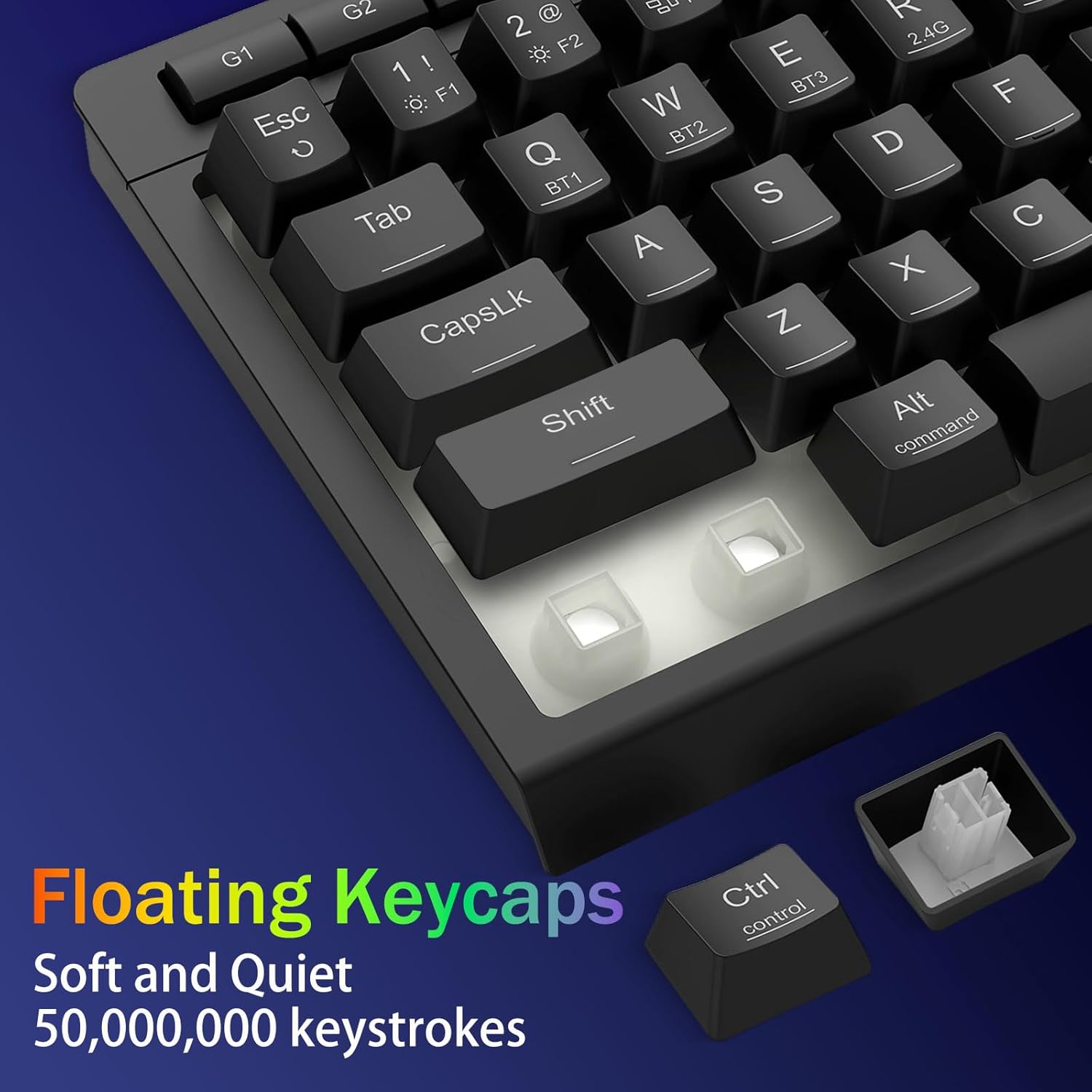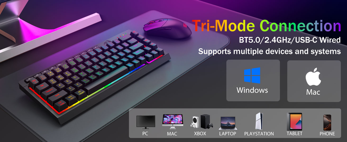 Drie-modus veelsydigheid en multi-toestel beheersing -Skakel naatloos tussen Bluetooth 5.0, 2.4GHz draadlose of USB-C bedrade modusse, en koppel tot 5 toestelle gelyktydig (PC, Mac, tablette, fone, PS/XBOX). Wissel toestelle moeiteloos deur middel van kortpadsleutels of syknoppie - perfek vir hibriede werk-/speletjie-opstellings. Bly vir weke aangedryf met die 4 000 mAh-battery (30+ dae bystand, 50 uur RGB-looptyd).