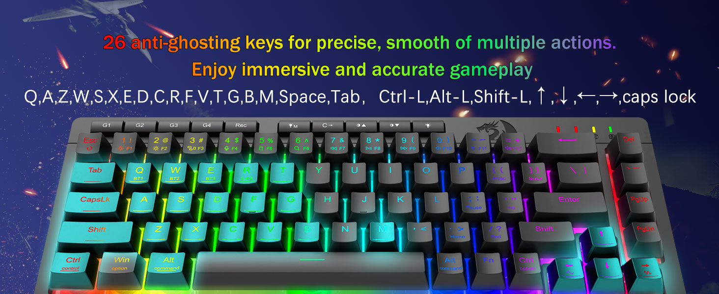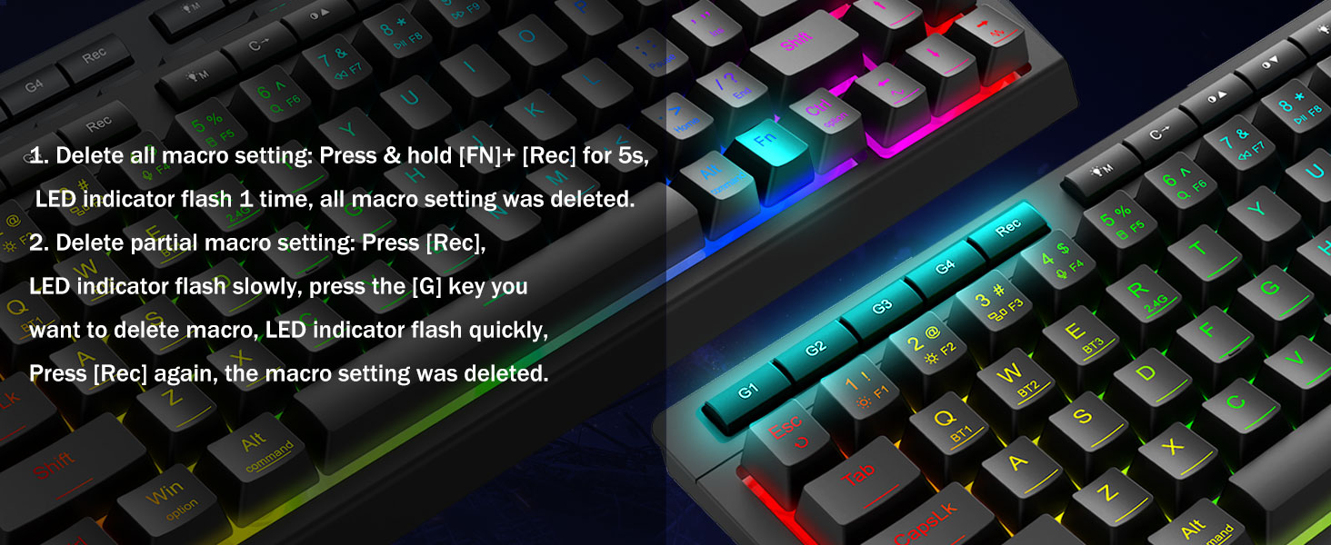 Aanpasbare makro's, moeitelose beheer -Programmeer die 4 makro-sleutels aan boord (G1-G4) onmiddellik—geen sagteware benodig nie. Teken komplekse kombinasies op vir speletjies, kortpaaie vir produktiwiteit of media-opdragte. Herdefinieer jou werkvloei in sekondes. Jy kan ook sagteware gebruik om funksies aan te pas, makro's te skep, RGB-ligte aan te pas en kortpaaie te stel. Sagteware skakel: bit.ly/K524RGB-PRODriver
