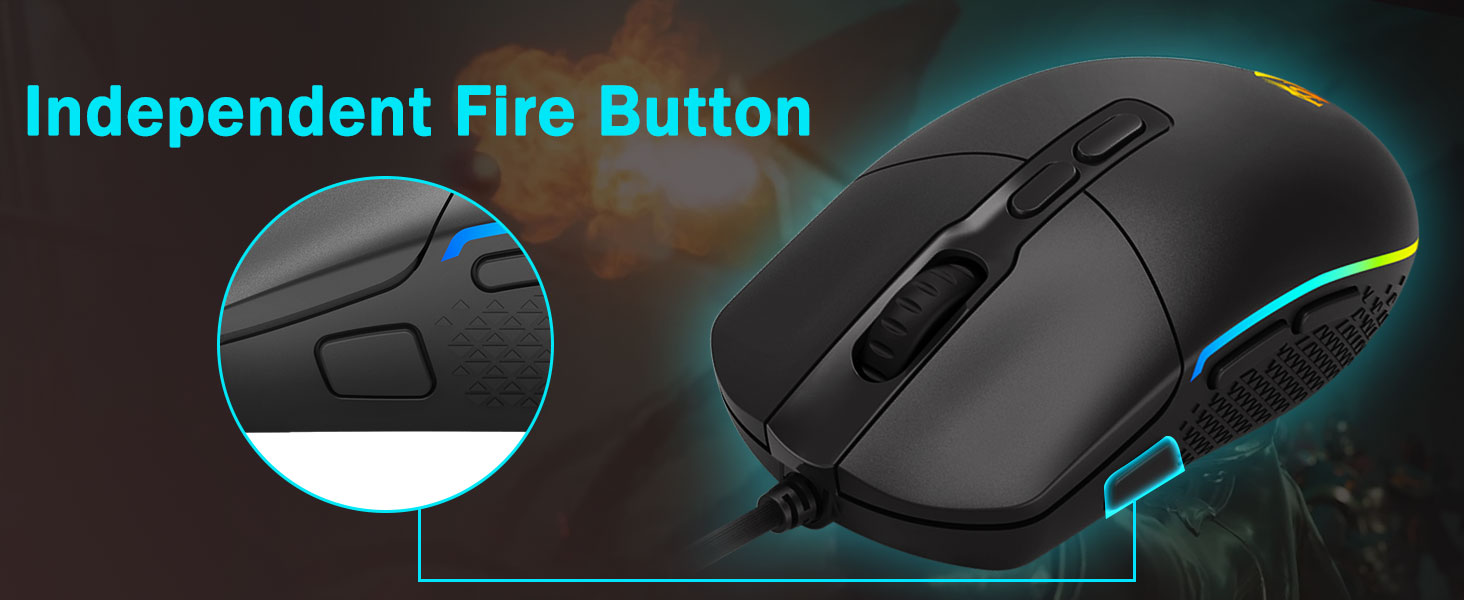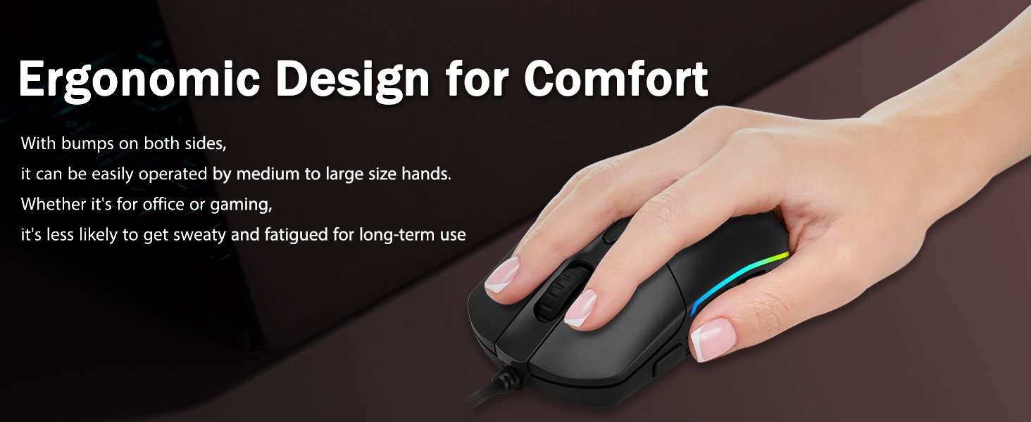 Comfort Grip- Die ergonomiese knoppe aan beide kante maak dat speelmuise in enige hande pas. Dit bied langdurige gemak vir spelers, sonder moegheid selfs gedurende lang ure van intense spel. Dit sal nie gly wanneer jy die speelmuis oplig of vinnige en presiese vee maak nie.