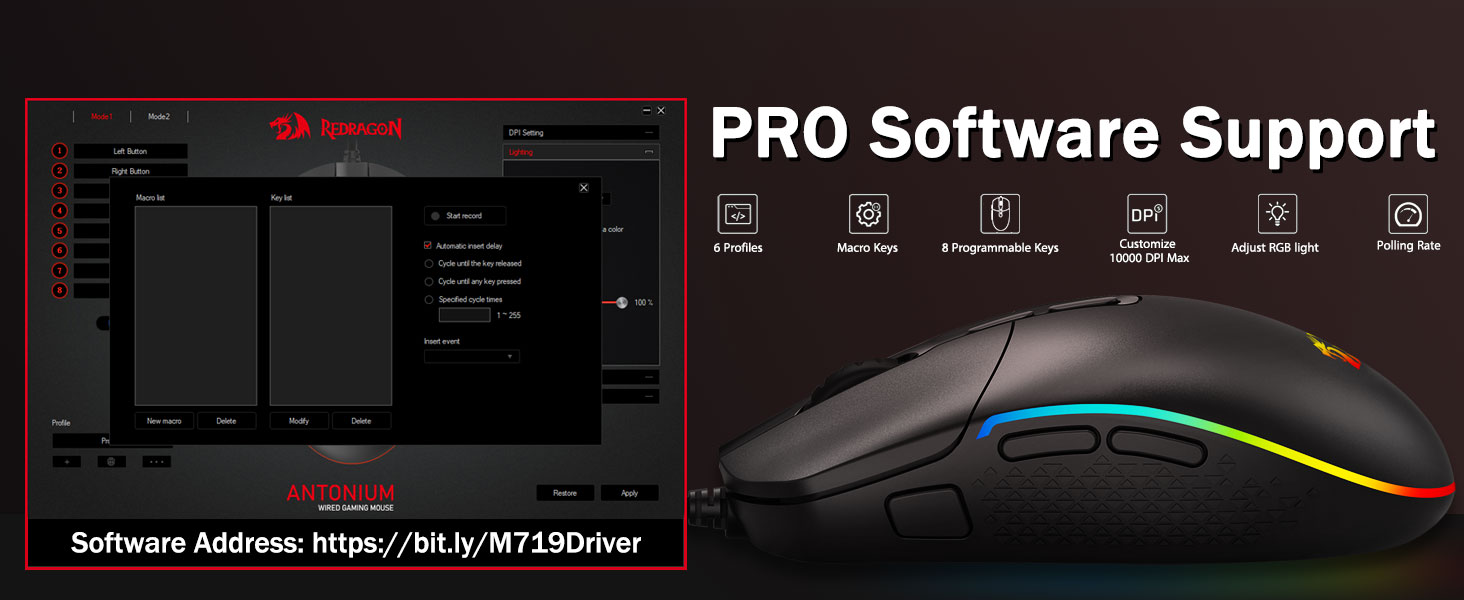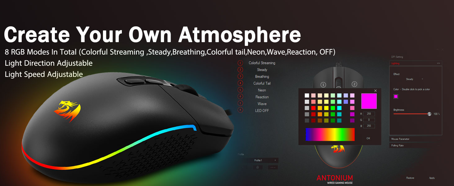 8 ordentlike RGB-agtergrondbeligtingsmodusse- Skakel die agtergrond aan en maak 'n paar moorde in jou spelslagveld. Die opwindende dinamiese RGB-agtergrondbeligting sal jou nooit in die steek laat wanneer jy jou speelruimte versier nie, dit sal beter wees met ander Redragon-bykomstighede met ligte aan.