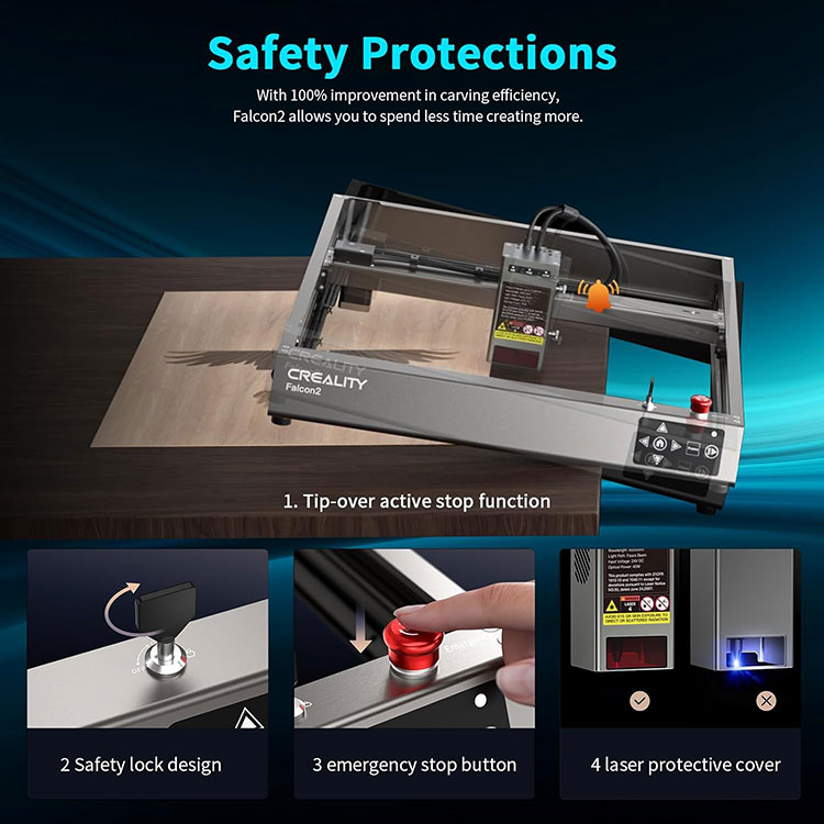 · Ultra-vinnige lasergravermasjien:Die maksimum verwerkingsnelheid van Creality FALCON2 kan 25000 mm/min produktiwiteit bereik. Met 2x vinniger graveerspoed, kan u u graverende kunswerke vinnig en goed voltooi.