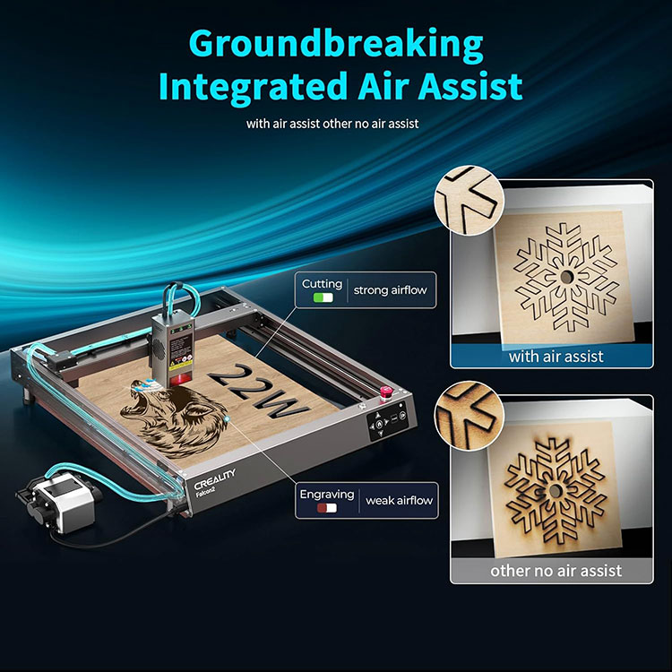 · Baanbrekende geïntegreerde lughulp:Pas die lughulp handmatig deur die knop aan, of dit kan die lugvloei outomaties deur Lightburn verstel, om rook te verwyder en die laserlens te beskerm, wat 'n skoner resultaat lewer.