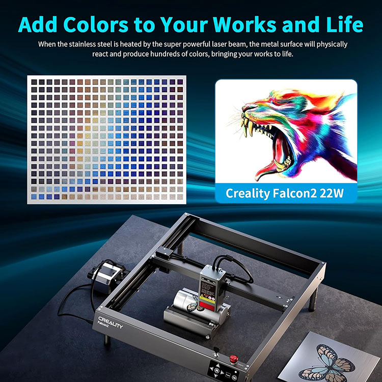 · Kleurvolle werk kleurvolle lewe:As die vlekvrye staal verhit word deur die super kragtige laserstraal van die Creality Laser -graveermasjien, sal die metaaloppervlak fisies reageer en honderde kleure produseer, wat u werke tot lewe bring. Slot u kreatiwiteit met Creality Falcon2.