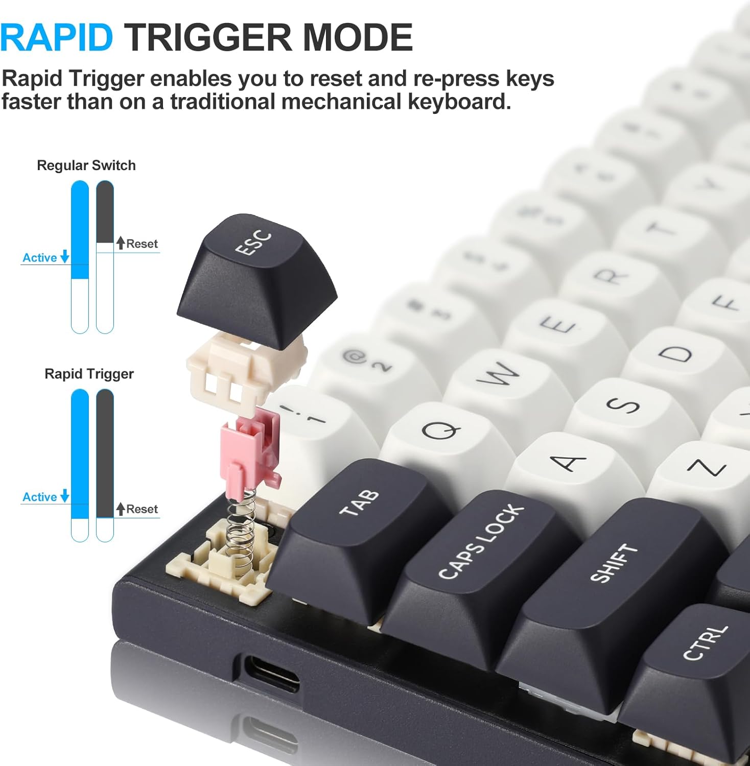 Kompakte speletjie-sleutelborde het toenemend gewild geword onder spelers wat lessenaarspasie, spoed en akkuraatheid waardeer. Die Wit/Blou-Swart K701 Rapid Trigger 60% Wired Magnetic Switch Mechanical Gaming Keyboard is ontwerp om aan hierdie behoeftes te voldoen met 'n vaartbelynde uitleg, gevorderde magnetiese skakelaartegnologie en 'n responsiewe bedrade verbinding.
