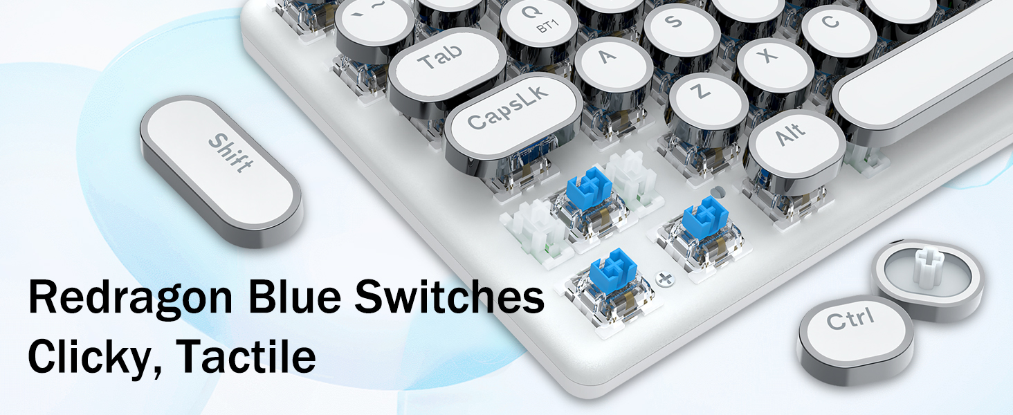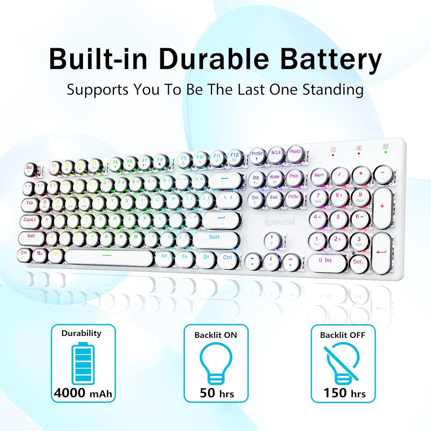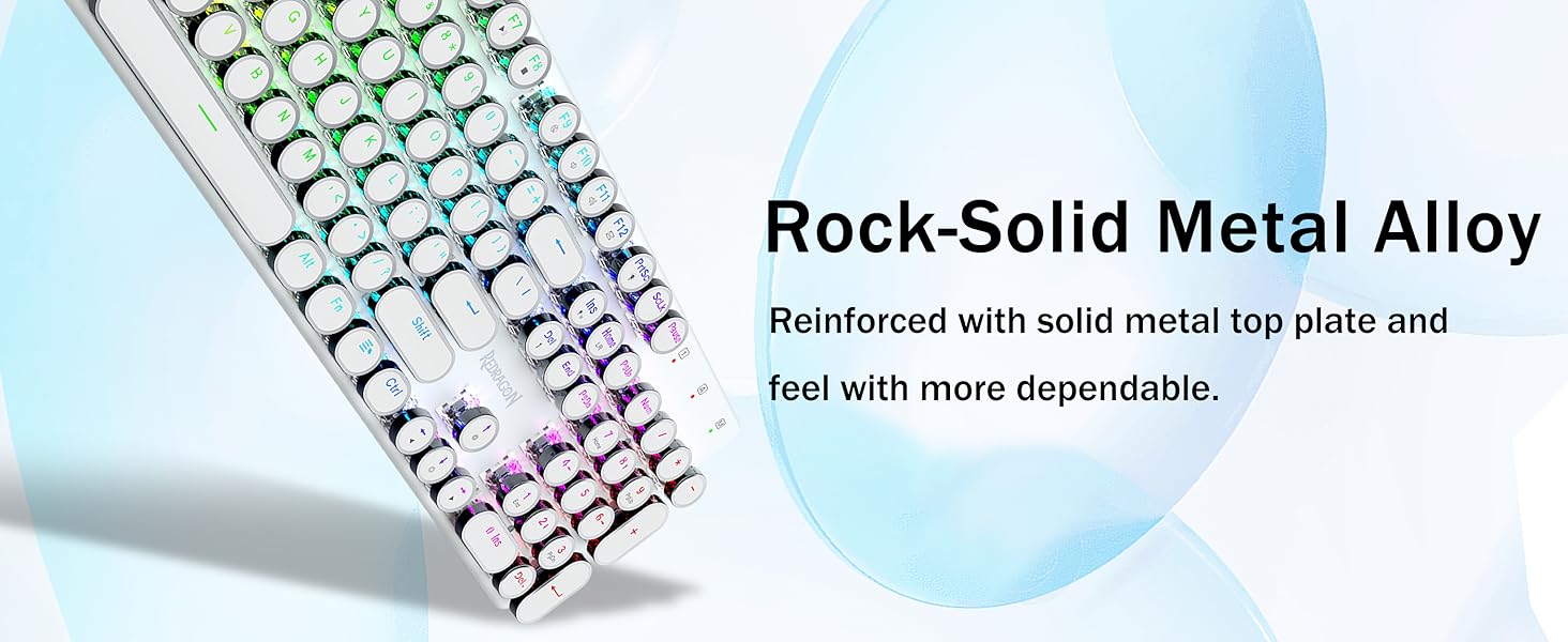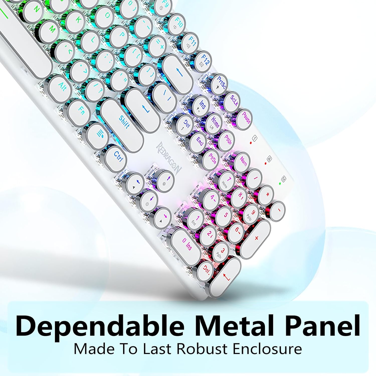 𝗥𝗲𝘁𝗿𝗼 𝗧𝘆𝗽𝗲𝘄𝗿𝗶𝘁𝗲𝗿 𝗦𝘁𝘆𝗹𝗲 𝘄𝗶𝘁 𝗠𝗲𝗰𝗵𝗮𝗻𝗶𝗰𝗮𝗹 𝗞𝗲𝘆𝘀- Redragon Meganiese blou skakelaars bied medium weerstand, hoorbare klikklank en tasbare terugvoer, bied responsiewe en presiese spelomgewing en -verrigting. Vintage steampunk-sleutelbord ronde sleutelkappe lyk soos 'n klassieke tikmasjien, gee jou gemaklike tikgevoel en stabiele klikaanraking.