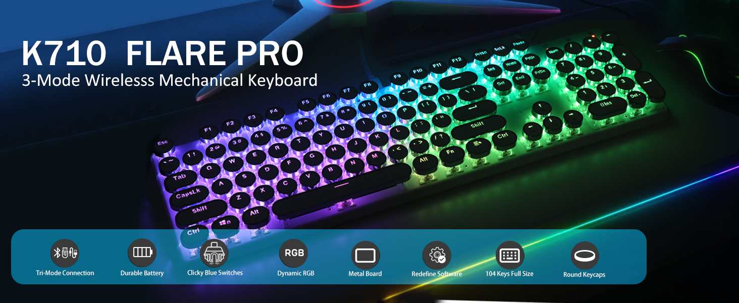 𝗗𝗲𝗽𝗲𝗻𝗱𝗮𝗯𝗹𝗲 𝗠𝗲𝘁𝗮𝗹 𝗣𝗮𝗻𝗲𝗹 & 𝟭𝗟𝗰 𝗔𝗻𝘁𝗶 𝗚𝗵𝗼𝘀𝘁𝗶𝗻𝗴- Opgradeerde FLARE PRO-weergawe gebruik steeds dieselfde tenkvaste metaalmateriaal. Hou die sleutelbord bestendig en elegant op die lessenaar, vir 'n uitstekende tikervaring. Die K710-sleutelbord ondersteun 104-sleutels teen-spooktegnologie, sodat verskeie sleutels gelyktydig gedruk kan word sonder konflik.