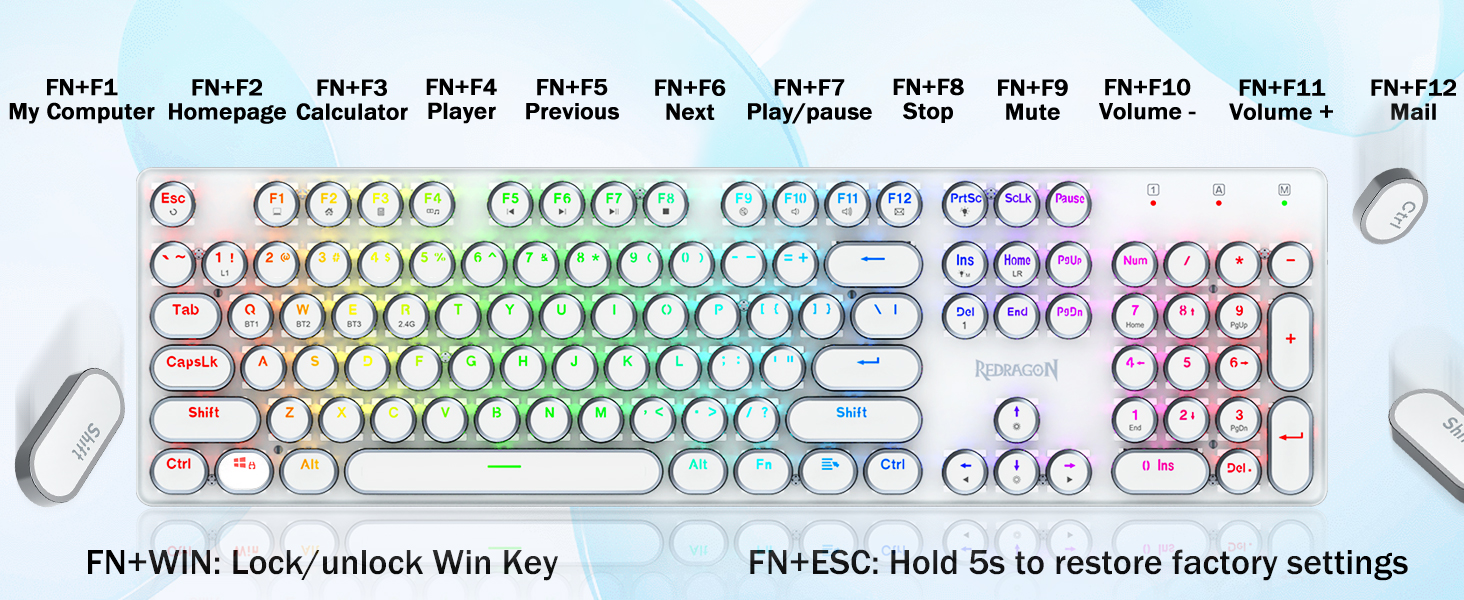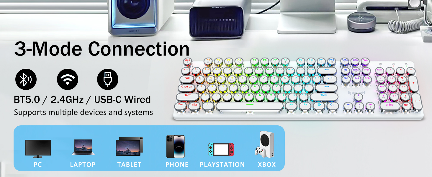 𝟯-𝗠𝗼𝗱𝗲 𝗖𝗼𝗻𝗻𝗲𝗰𝘁𝗶𝗼𝗻- Gerat met Redragon innoverende drie-modus verbinding tegnologie, USB-C bedraad, Bluetooth 3.0/5.0 & 2.4Ghz draadlose modusse wat die gebruikerservaring op alle terreine na 'n ander vlak laat opgradeer. Druk FN+Q/W/E na Bluetooth-modus, druk FN+R na 2.4G-modus.