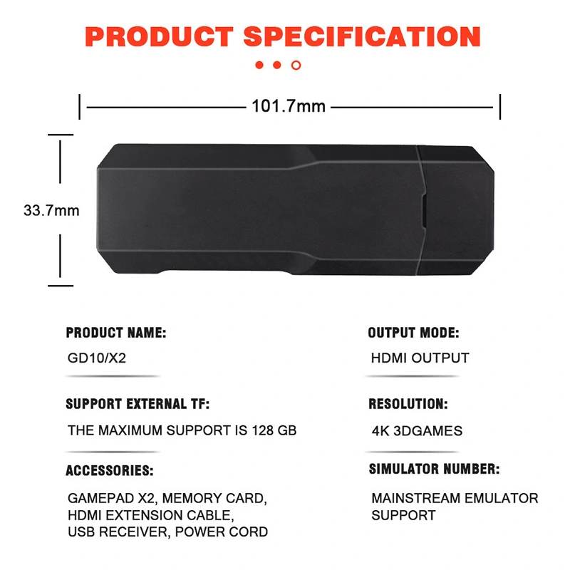 Huo Ji Video Gamepad Console 2.4G Wireless Controller met HD Game Stick Box 4K Geen behoefte aan u om af te laai nie, met 64 GB geheue. Dit kom met 1000 klassieke retro -TV -speletjies